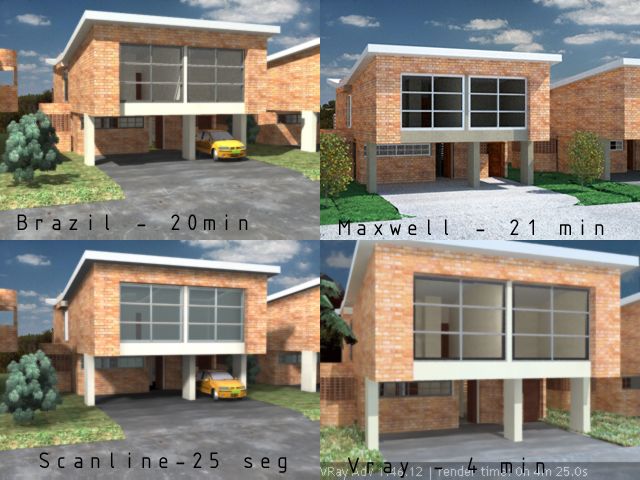 Linhitos tu iniciativa me pareció muy buena y creo que no hay grandes diferencias de calidad y si mucha en tiempo. Todas las imágenes están poco elaboradas,todas. Seguramente un especialista en Vray hace de eso una maravilla, otro en Brazil igual, y probablemente en scanlline igual. Solo una cosa es segura,Scanline tardará mucho menos, y eso que yo en exteriores si uso ya mucho Vray porque no es tan lento como en interiores.