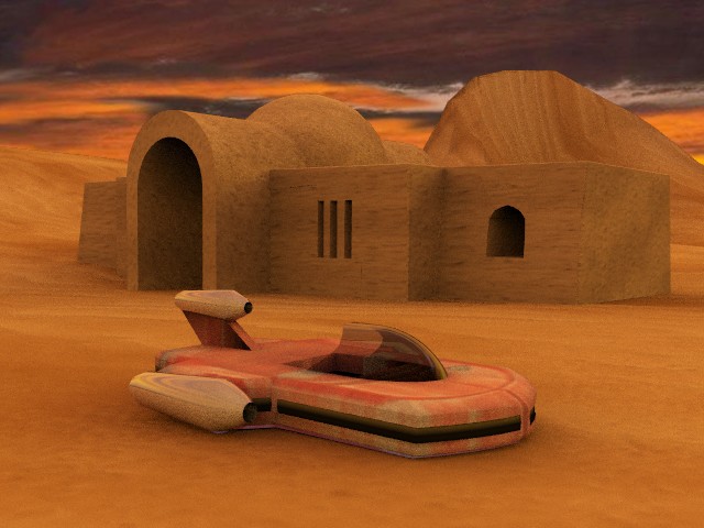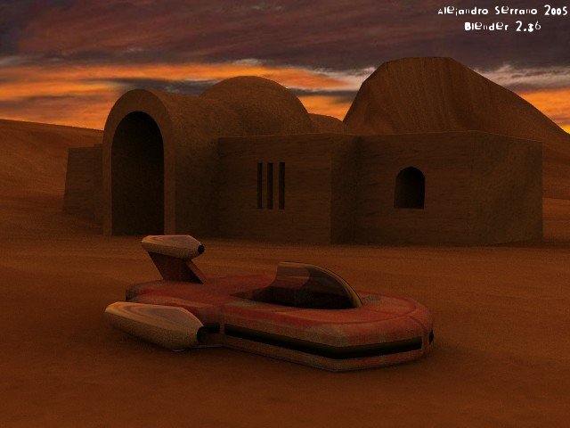 Objetos con polígonos insuficientes, faltan las sombras, falta bevel en las esquinas de la construcción, a la nave le falta de detalle, textura del suelo de muy baja resolución, el cielo de fondo no encaja con la iluminación, sobra el efecto Glow.Cita: