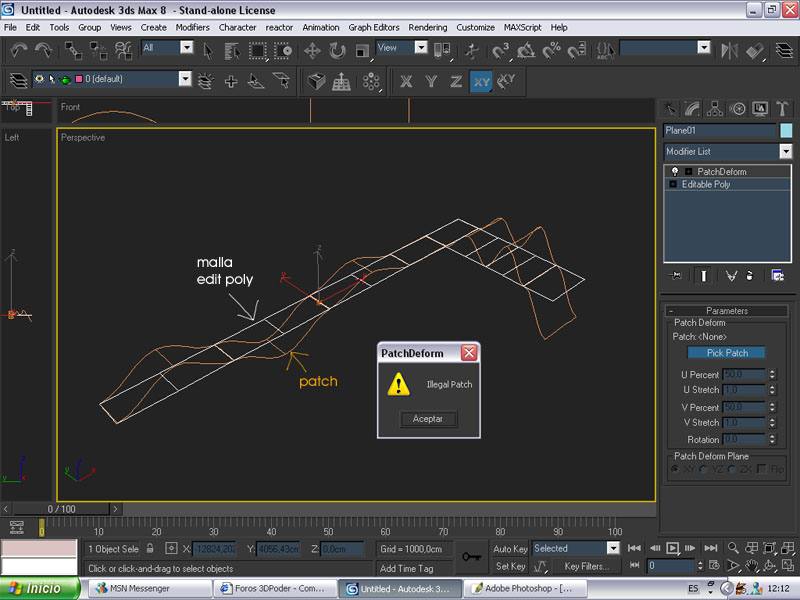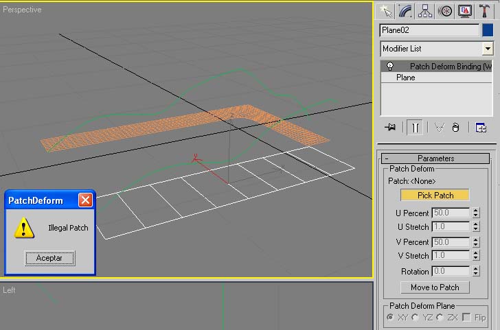 Quel: ahora me acuerdo, una vez me resultó lo que dices, pero luego lo deje por que fallo algo, explico. Me modele en plano una malla Edit Poly en forma de l.luego me cree un patch de 1 por 4 segmentos, aplique convert editable patch y el último segmento lateral lo extruí hacia al lado de forma de formar también una l modifique las alturas del patch, selecione la Edit Poly y di patch Deform, y me apareció algo que decía ilegal patch y no me dejo hacerlo, también intente haciéndolo soldando dos patch puestos perpendicularmente para formar la l y sucedía lo mismo.