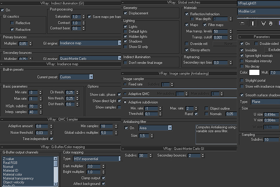 Decir, que en la escena hay en total 3 Vray Light (puerta/ventana y una detrás de la cámara) con un Diffuse subds. 350 y el Diffuse mult. 1.0, también hay una luz directa con 2500 de Diffuse dibs y 1.0 en mult.
