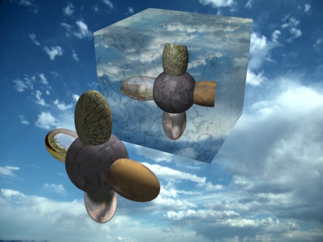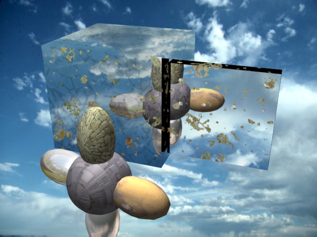 A no desesperar, veamos si esto cuadra un poco más con tus expectativas, el render de abajo muestra un tipo de suciedad que creo se asemeja más a lo que estás buscando. Es decir, son salpicones (no me preguntes de porqué te vas a reír, si te digo que mapas usé) los cuales quedan sobre el cristal. Esto básicamente se consigue con máscaras, en particular yo he recurrido a una mezcla de materiales (a un material mezcla) y he usado una máscara procedural porque es más práctica. A modo de ejemplo he usado una combinación de parámetros que me satisface a mí, pero tú puedes variarlos de formas inimaginables y para mostrar la potencia del método he dejado en el espejo original (el cúbico) la textura de cuarteado a la que le he aplicado los salpicones encima y al lado he creado un segundo espejo (con una sola cara reflectante por motivos de comodidad y economía de recursos) para mostrar la suciedad sin el efecto cuarteado. Creo que sobra decir que no hay límites a lo que se puede crear con un poco de paciencia y que por motivos de espacio no puedo ponerte todas las variantes renderizadas, antes de que me echen del foro, para que las veas, pero te aseguro que son muchas, sobre todo si usas mapas hechos a mano, que no es el caso que usé yo (esta vez por razones de tiempo), por ejemplo, para el barro o lascagadas de palomasdeberías realizar la textura en alguna aplicación comoCorel PhotoPainto adobe Photoshop, ya que estas incluso te permiten definir con exactitud algunas particularidades que solos bitmaps admiten. Por último, decir que puedes combinar tantos efectos como quieras o necesites solo limitada por la potencia del equipo, y recalcar que no desesperes si a la primera no conseguís lo que quieres ya que el texturizado es casi una materia completa dentro del diseño 3d y yo diría que en maxel editor de texturas es la baza principal del programa y el manejarlo no ya en forma experta sino apenas correctamente, es una larga y ardua tarea de aprendizaje, posdata: si crees que esto último te puede servir, me pasas tu mail y te envío el fichero de ejemplo (el fuente en 3ds Max, no el render) y una explicación sencilla de cómo realizarlo.