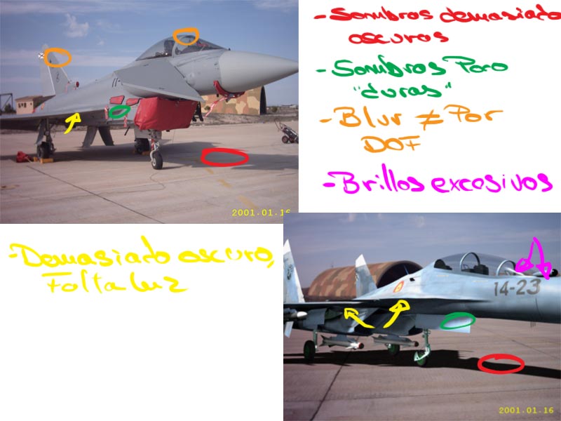 Gracias, sobre a todo a ti Greenpix, eso son exactamente lo que tengo que mejorar en mente. Los especulares no tanto, porque eso depende de la pintura del avión, el Eurofighter Typhoon es más nuevo (solo hay cuatro actualmente), pero la pintura es más mate, si os pongo el Mirage f-1 brillaba en comparación con el Eurofighter Typhoon y el f-18 estaba sucio, pero las sombras y sobre todo el Dof (campo de profundidad).