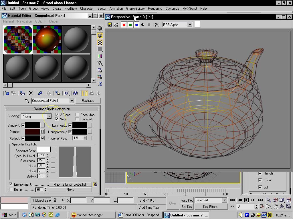 Muy buen trabajo el de tu Mustang, bueno el render wireframe logras activando la casilla de wireframe en el editor de materiales (parámetros básicos) te adjunto una imagen.