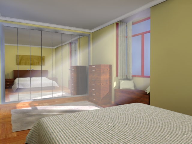 Gracias hola por tus consejos. Me he puesto de nuevo con el dormitorio, dándole ciertos retoques con Adobe Photoshop, y he creado la misma escena, pero nocturna.