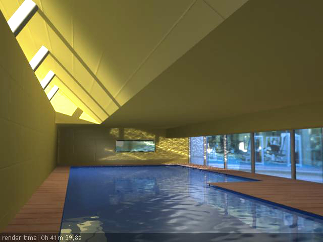 El agua de la piscina está bastante bien logrado. Trabaja más la entrada de la luz en los sitios y si es necesario tira de Photoshop para retocar. No sabría decir si las cáusticas de la pared son correctas, pero me da la sensación de que no.