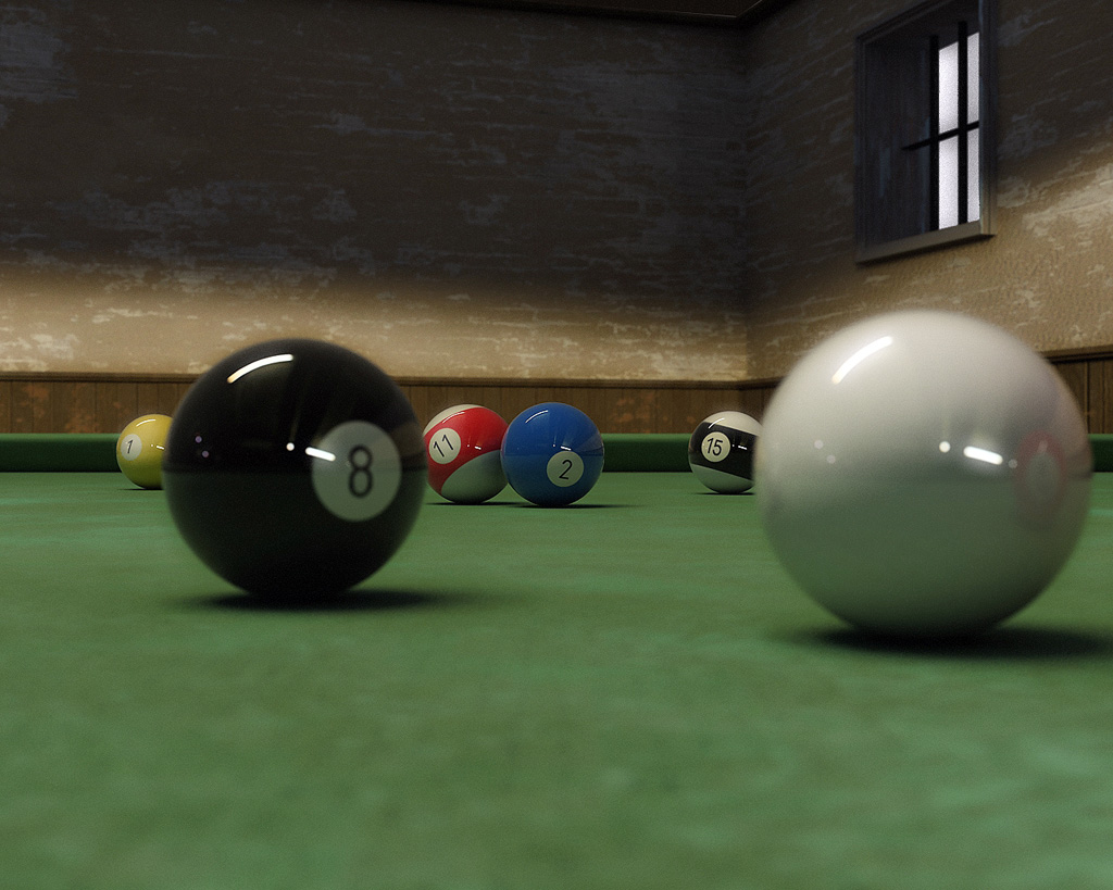 Como dice, un poco de añejamiento en las bolas no vendría mal, y más cuando las paredes de la sala están tan descuidadas, la mesa y bolas también deberían estar un poco deterioradas, incluso le daría más carácter a la escena, no solo realismo. Saludos.