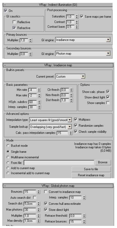 Irradiance map en el primario y Photon Map en el secundario. Cargando la config custom a : high y luego el hsph subdivisiones: 40, interp samples: 30, min: -4, max: -2 (por ejemplo). Para probas.