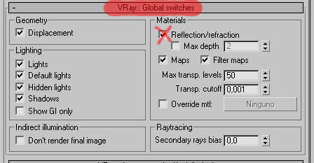 Adjunto la imagen donde podrás ver lo de la reflexión/refracción. Sería muy conveniente que lo desactivases de cara a seguir con pruebas. Sobre todo, si tienes esos tiempos tan monstruosos que dices. Suerte y no desanimes.
