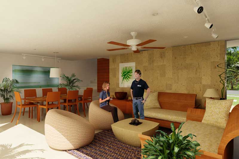 Efecto de rayo de luz? Pues me lo da la misma luz exterior, la ombra del árbol fue puesta en Adobe Photoshop, pero, usando un fill layer en color solido, un café oscuro con opacidad pues, a lo que he visto, las sombras producidas con Vray, radiosidad, no son negras sino, que toman el color del material oscureciendo.