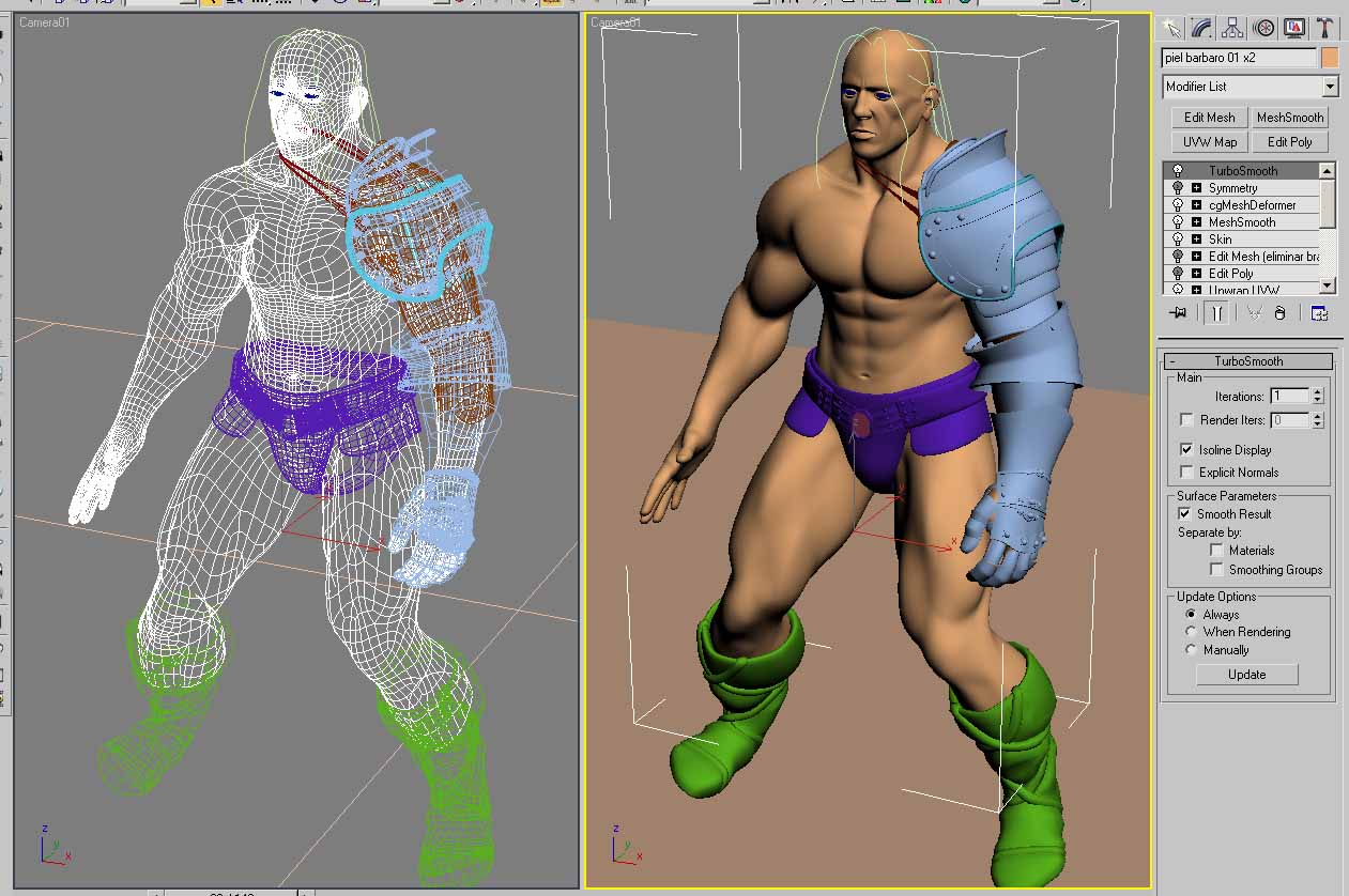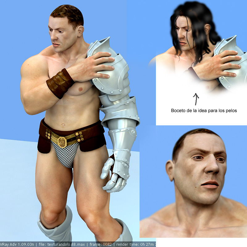 Bueno chicos solo os diré que le deis caña al Bodypaint 3d, que con el mis sueños se hicieron realidad, la textura es de subobjeto, brazos, piernas, pecho, cabeza, manos, cada uno con material Vray, texturas de 1000 por 1000 (la cara 2000) en efecto a la pulsera le baje brillo, es que estos renders no son los últimos, pero casi, no los tengo aquí, peor que más da, y el hecho de que la pulsera sea de curva redonda la hace brillar más, así que, le di filos, ahora está mucho mejor, es cierto lo del labi, ya me fij, y me lo dijeron otros, pero creo que eso lo dejare, al fin y al cabo, esto es para una animación, no creo que se llegue a notar mucho, no os enseñe nada con pelos, el taparrabos y las botas tienen pelo, y mola más, la armadura estoy aún con ella, si queréis dar ideas, estoy abierto, (para la armadura) también quiero petarlo de tatuajes por la zona del brazo derecho, cara y pecho, hacerle algunas cicatrices que lo hagan asimétrico, ponerle un collar. Gracias tíos.
