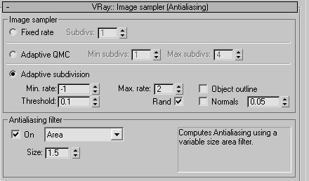 Aquí te dejo dos capturas dónde están los parámetros de antialiasing en Mental y Vray, que es donde se soluciona el dentado de las imágenes.