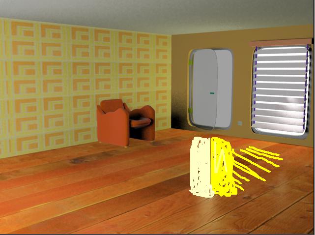 He estado varias horas probando y nada, no me sale una buena iluminación, incluso he metido por ahí un Vray por la habitación, bueno, por ahora no me preocupo de eso ya que me van a mandar algunos parámetros para hacerlo más real, bueno, lo que quiero conseguir es que entren rayos de luz por la ventana y quede tal como dibujo en la imagen.