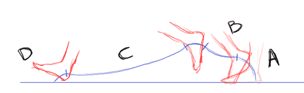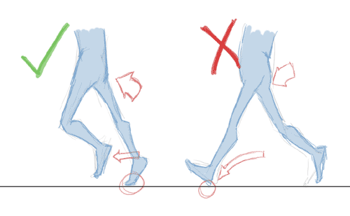 La punta de los pies (la zona de los dedos) se arquea hacia atrás cuando empieza a avanzar hacia adelante, dando una impresión muy elactica poco creíble.