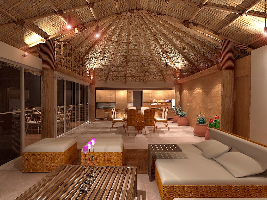 No sé cómo hacer un techo de palapa. ¿alguien conoce alguna técnica? El interior esta echo en 3dsmax 7 renderizado con Vray 1.09 por favor ayuda a terminarlo, y si no es mucha molestia me gustaría que me dijeran algún otro error que yo por falta de experiencia en el 3d no los veo.