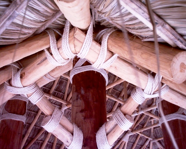 Así mismo, los troncos que forman la estructura de la palapa debería de llevar ammares de cuerda donde se intersecten o cruzen dos troncos, esto, le ayudaría a darle más realismo a la escena sin embargo, puede llegar a hacer más pesado el archivo y, por consiguiente más lento el proceso de renderizado.