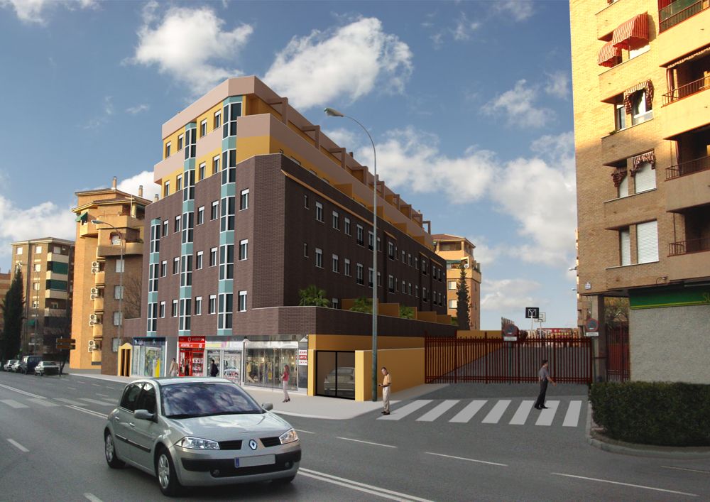 La integración me gusta, aunque le daría un poco más de caña a la iluminación. Si te fijas es una luz de atardecer y bastante potente, yo le daría más intensidad a tu fuente de luz principal y pondría un volumen por delante para que realizase sombra en tu fachada, al igual que la tienen los edificios colindantes.