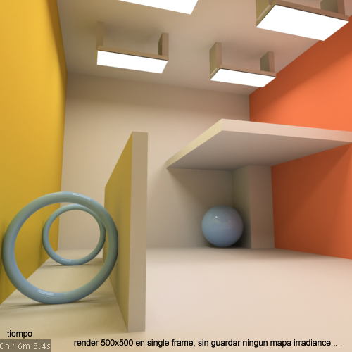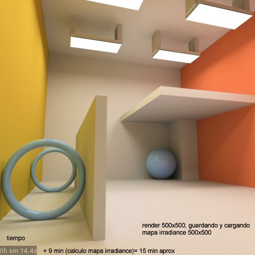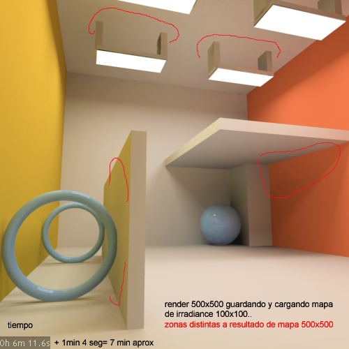 El render lo saque ha 500 por 500 y los mapas de irradiance a 100 por 100 (bastante extremo) y a 500 por 500 para comparar, los tiempos como dice Kike son notablemente diferentes, pero también hay que ver las diferencias de calidad.