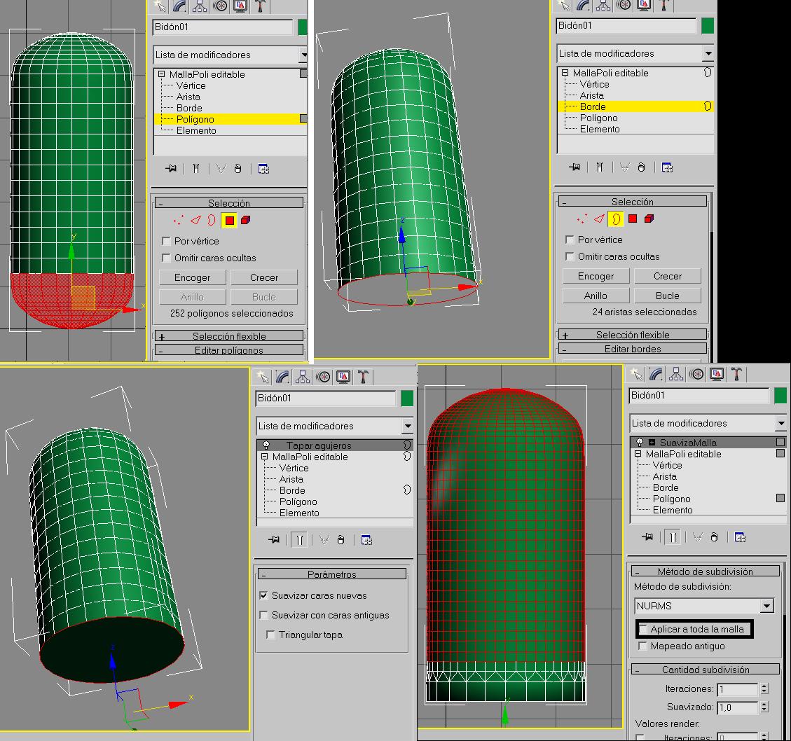 Hola Promineo. Mira la primera imagen son las pruebas que hice con msmooth. Fíjate en lo que parece como una estrella en la parte redondeada del cilindro. Tiene unos polígonos muy angulosos y marcados, y al hacer el render básico del 3ds Max, el que muestra lo que ves por el visor, pues se ven mucho esos picos. Lo que yo decía es cómo hacer para suavizar esa malla que hace el msmooth así por defecto.