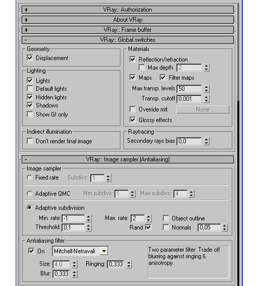 Aquí les dejo los parámetros del Vray que estoy utilizando, también tengo un problema con el virio de la mesa, me tocó activar el actve shadow para que dejara pasar la luz, es eso correcto, o debo hacerlo de otra manera?
