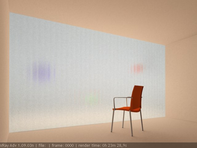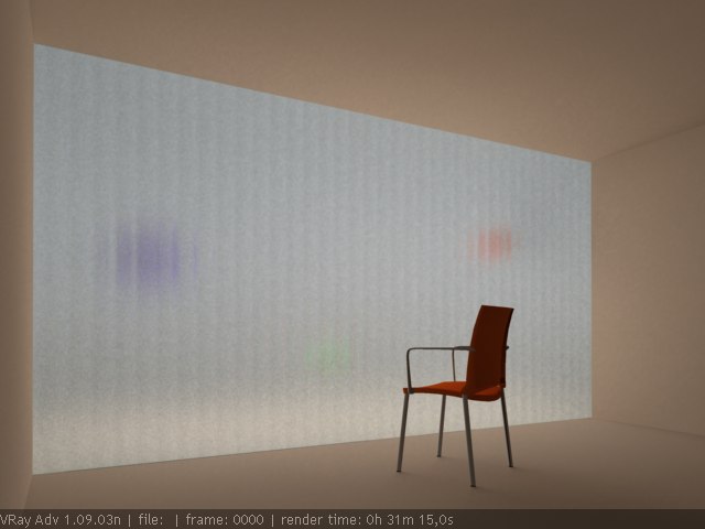 Bueno, he avanzado en algunos aspectos, pero en otros he ido para atrás. Pongo una muestra de lo que voy consiguiendo. En realidad, lo único que he logrado hacer es que el vidrio deje pasar la luz de una forma difusa. En la imagen se ve cómo queda ese espacio interior bañado por una luz tenue. La escena tan solo tiene una luz Vray en el exterior que traspasa el vidrio e ilumina la estancia.