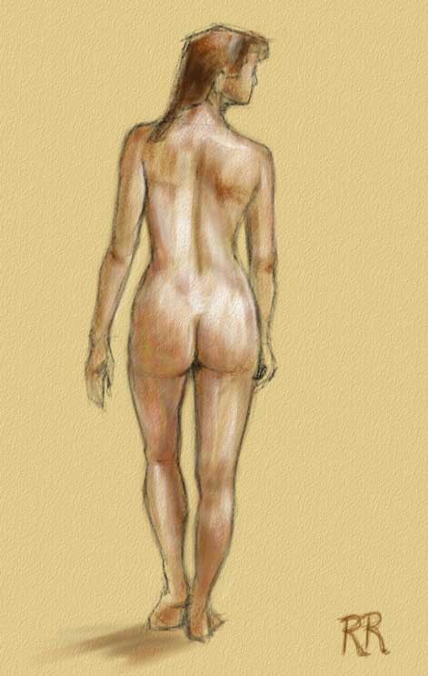 En cuanto a los apuntes de Birkov no pensaba decir nada, pero ya que sacas el tema lo que opino es: no me parecen para nada acertados, la verdad es que realmente nada. La mano queda peor y los ojos los pinte así porque así los tiene la modelo, o al menos así los vi yo, y por tanto así son para mí, para eso soy el artista. Sobre la luz que añadió sobre el culo opino que no es correcta porque en esa parte de la fotografía hay oscuridad y por tanto el culo de la chica recibe menos luz, de ahí que parezca poco iluminado y por tanto plano. Pero eso es irrelevante al fin y al cabo, no todos los culos tienen que parecer redondos todo el tiempo, la luz es muy caprichosa y la realidad nunca responde a los esquemas prefijados que aparecen en los libros. Yo retrato la realidad y me ciño a lo que aparece en las fotografías que uso de referencia.