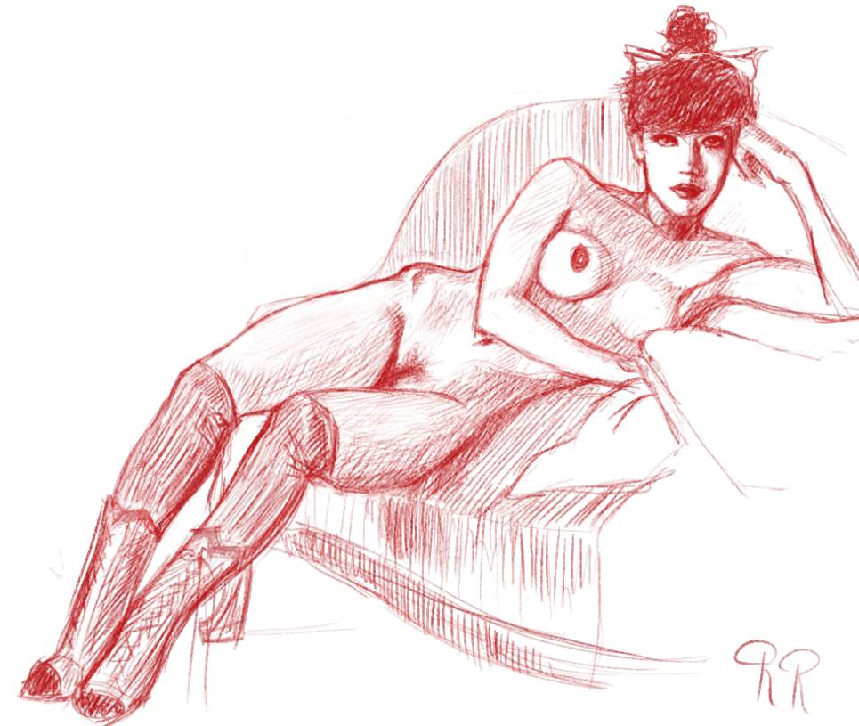 Me gusta mucho el dibujo, pero, ¿no le falta una pierna? Intento trazar por dónde iría y o se ve la planta del pie apoyada en el culo, o se vería el muslo salir por delante, no me cuadra, pero está chulo. Un saludo.