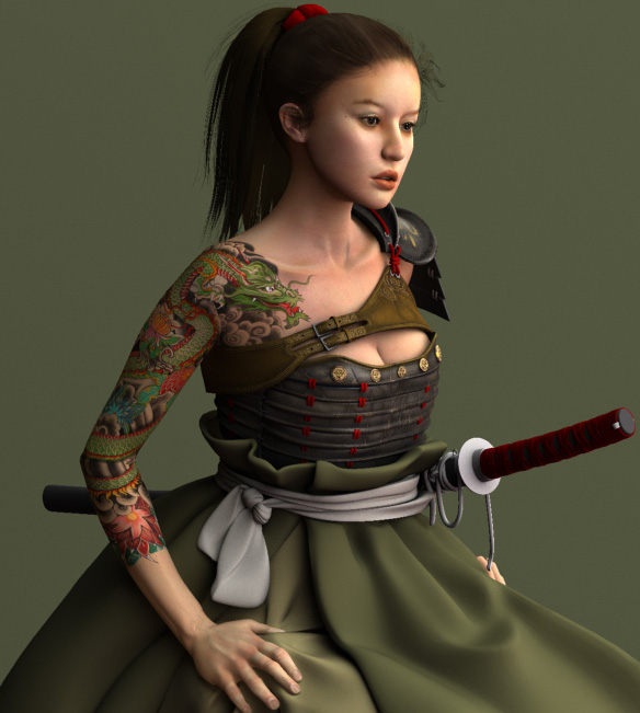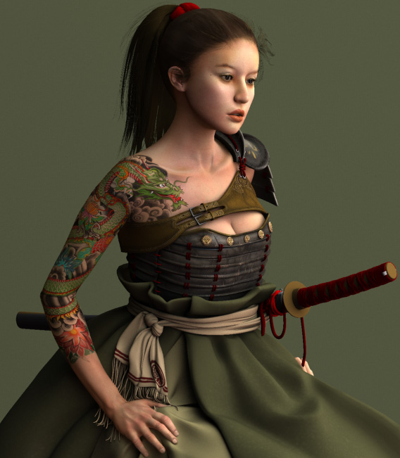 Me encanta, los tonos, la fisonomía, y el tat, u, son geniales. La postura me resulta muy femenina, y junto a la expresión de la cara le dan un aire muy expresivo. Como colofón le podrías añadir un abanico en la mano derecha, muchas veces representaban a los Samuráis con uno en la mano contraria a la katana. Lo que pasa es que me gusta tanto como te ha quedado la mano así que, casi sería estropearlo.