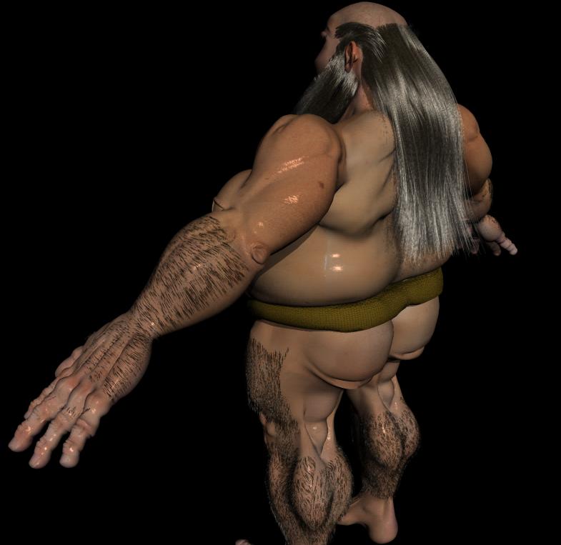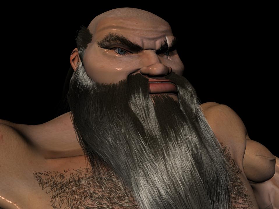 El desplazamiento de las venas es demasiado exagerado, y los músculos están demasiado pronunciados el pelo de la barba más o menos lo tienes, pero el del pecho está muy verde todavía. Yo sinceramente el módulo de pelo no lo he tocado mucho por lo que no te puede ayudar mucho en el tema de materiales, pero creo que no tiene que ser muy complicado trabajarte un material graso.