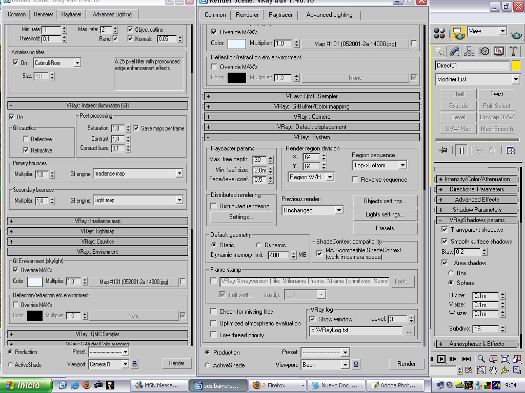 No se ven los parámetros de Lightmap y de Irradiance Map, que son los fundamentales para poder ayudarte. La otra es que no se ve el multiplicador de la luz directa y que sin saber la escala de tu modelo no te puedo decir si los parámetros de sombras suaves son válidos o no.