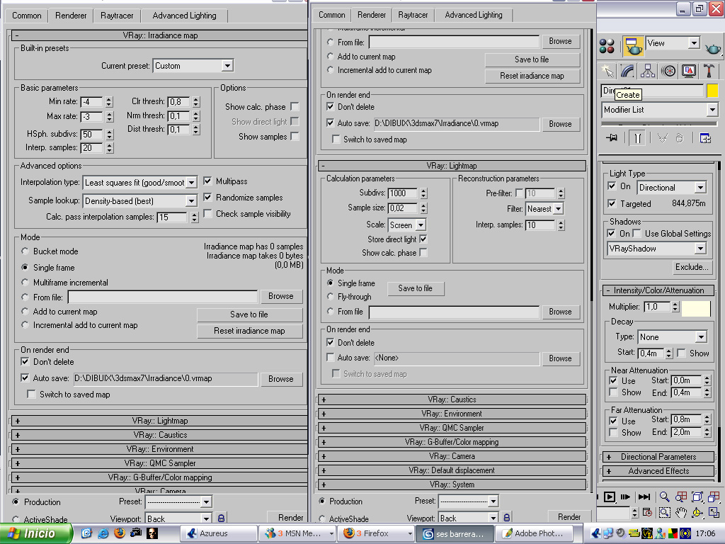 El mapa de irradiancia lo tienes un poco desequilibrado, no tiene sentido poner un 0.8 en el color threshold y un 0,1 en el normal, sobre todo si dejas el Dist en 0,1. Prueba con 0,3-0,3 y 0,2, sube el multiplicador de la luz y tiñelo de naranja (tampoco demasiado), sobre todo si tiras con Hsv exp en el Color Mapping y de momento no pongas sombras suaves, para ajustarlas siempre hay tiempo, ahora queremos ajustar la iluminación. El Lightmap está bien, pero le bajaría a 0,01 el sample size para darle un poco más de precisión, además de quitar el filtrado (que solo sirve para animación).