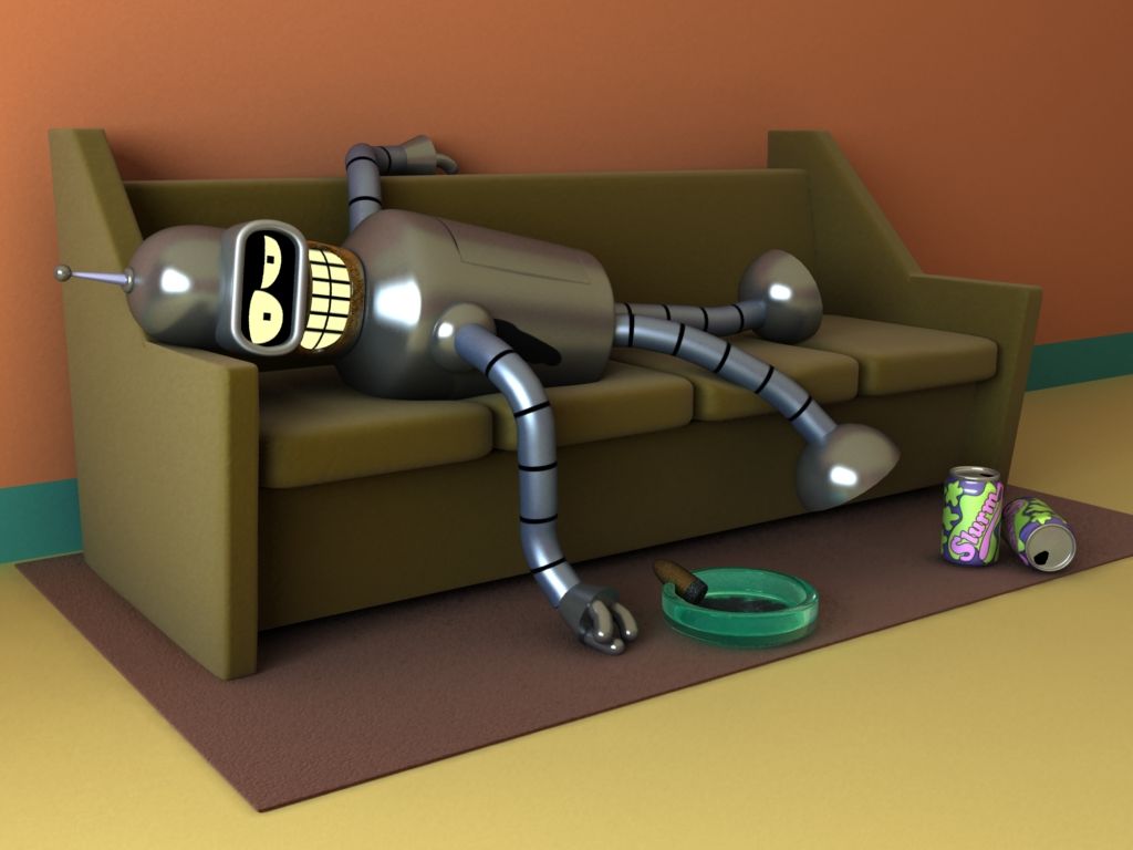Vaya me encanta ese robot. Pero un dato interesante, si se ve la serie de televisión de futurama nos damos cuenta de que Bender cuando esta sobrío tiene un aspecto de borracho, y cuando toma licor esta sobrio, algo retórico, pero así lo expone la serie, me encanta.