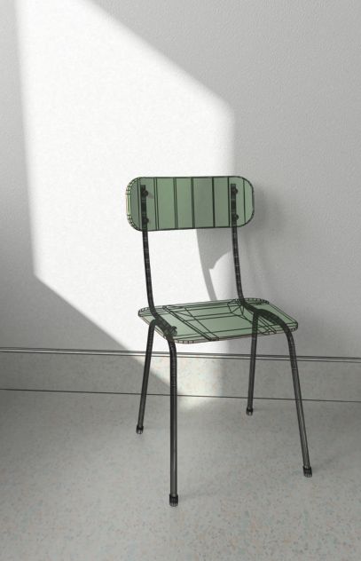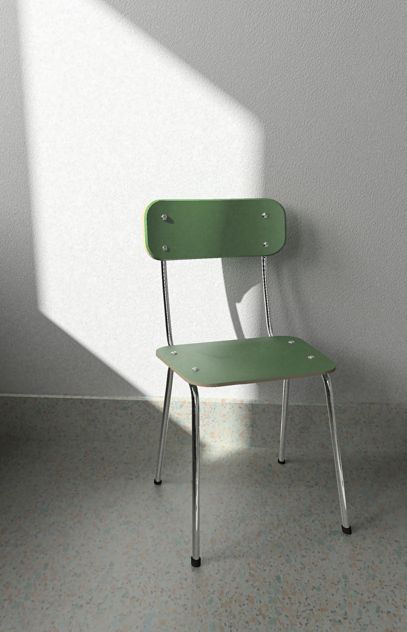 Muy buena la imagen. Aparte de la esquina que forman el suelo y la pared que no se ve, solo se intuye, la sombra que proyecta la silla no me convence demasiado, seguramente esté bien, pero simplemente no lo veo bien.