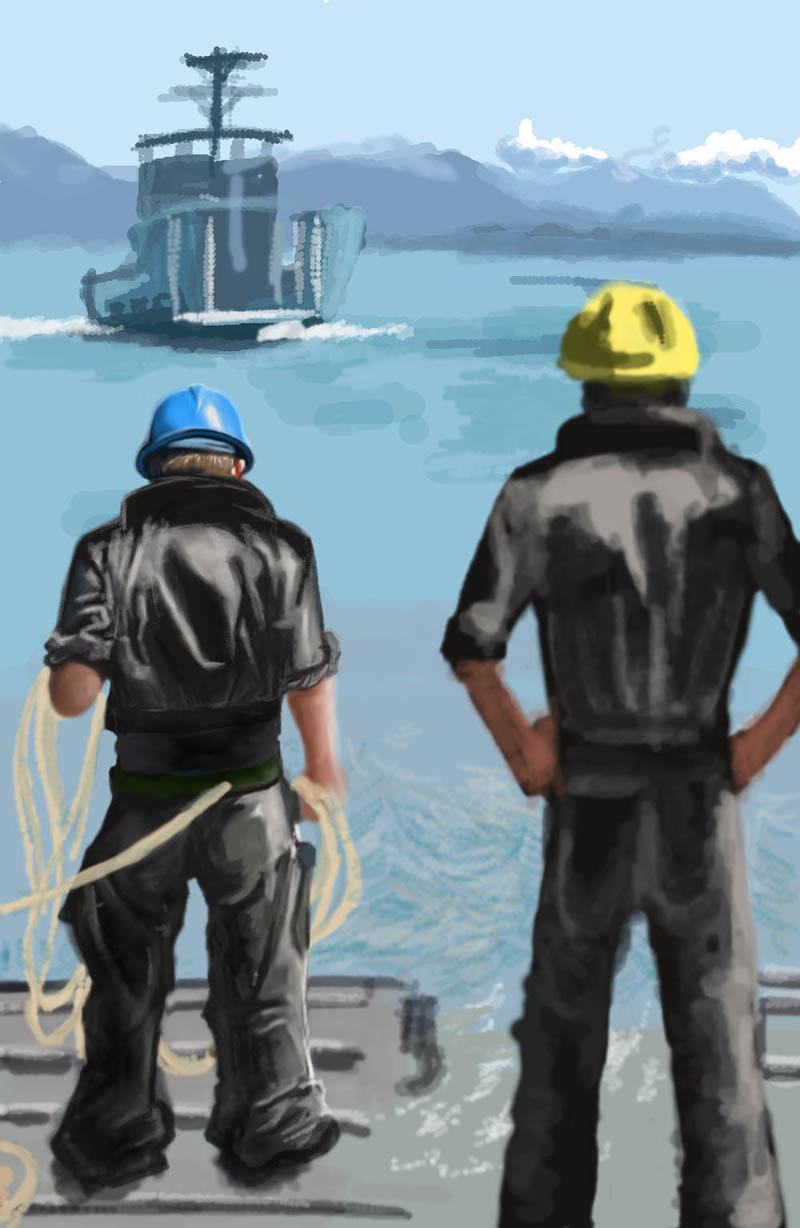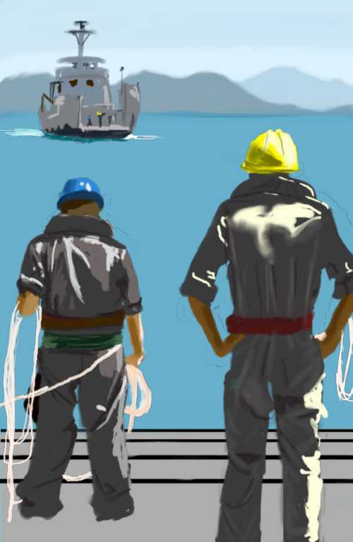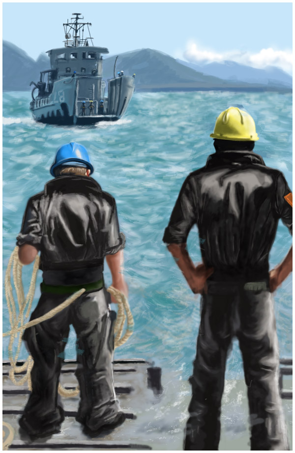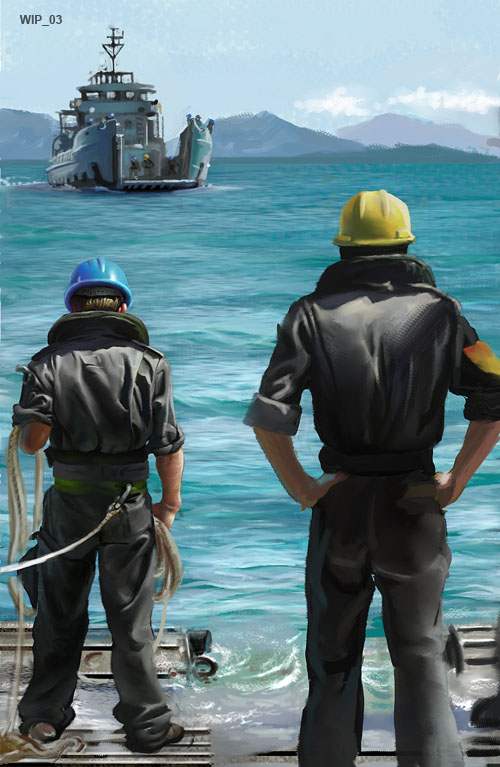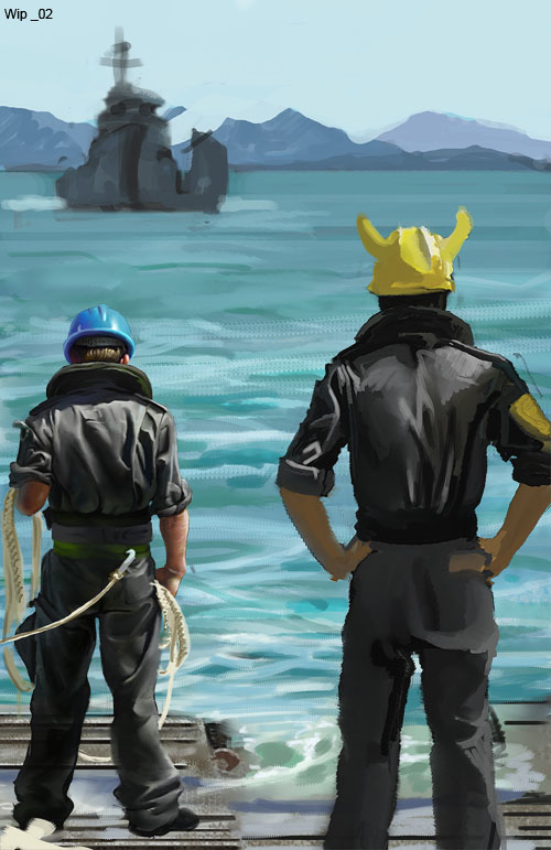 A lo largo del proceso he cambiado de programa, lo cual rompe el flujo de trabajo, porque tuve que acostumbrarme a nuevos pinceles, los marineros están hechos con Artweaver y el barco con Adobe Photoshop.