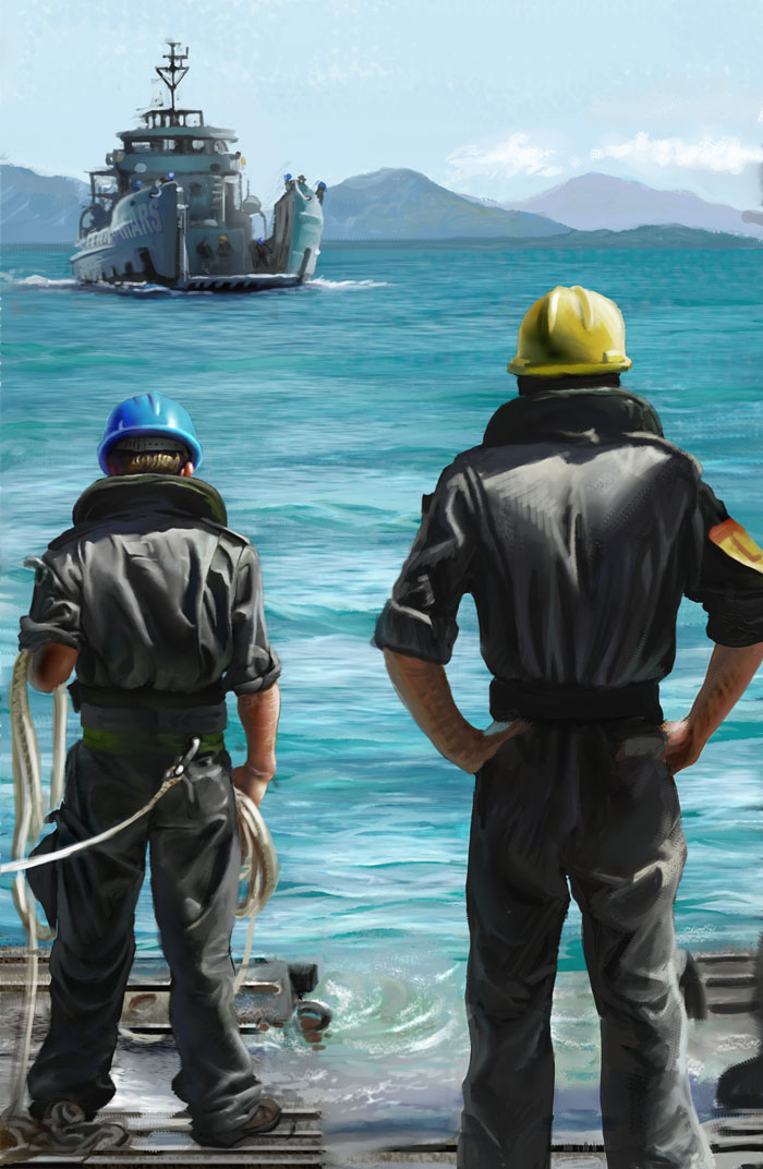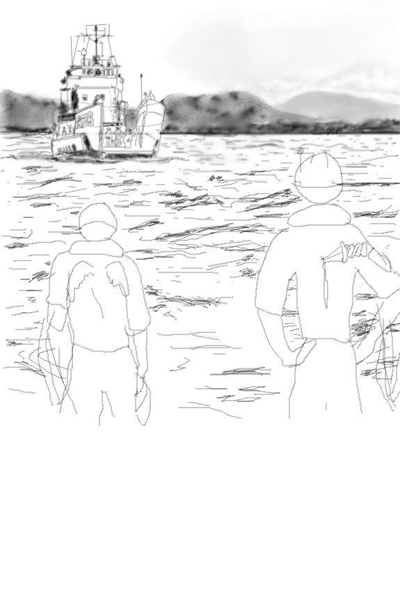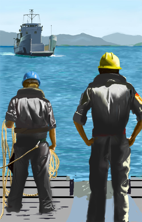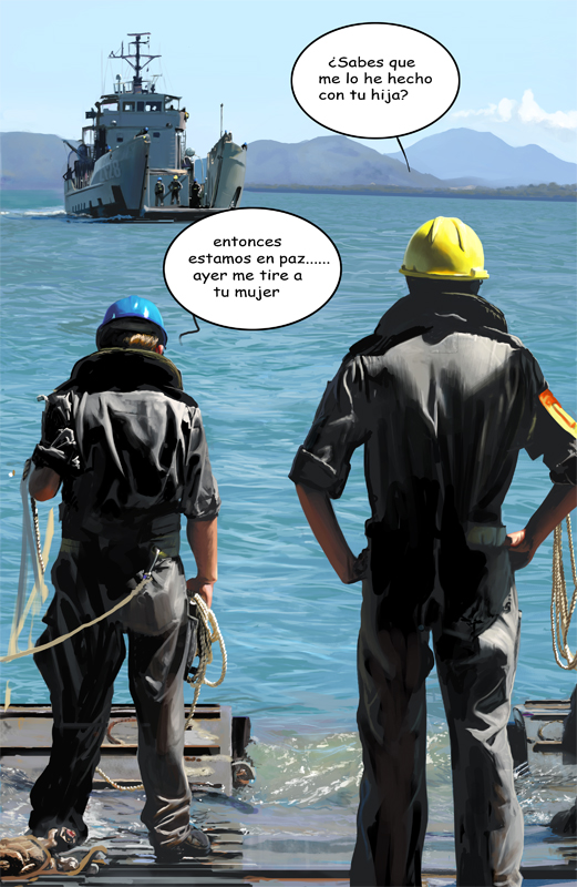 Bueno, pues esto es lo que me ha dado tiempo a hacer, la verdad es que me ha gustado bastante hacer esta imagen. Mis marineros están asombrados, porque están viendo zarpar el barco sin nadie a bordo, vaya putada.