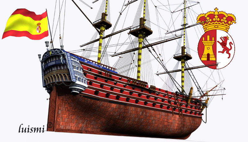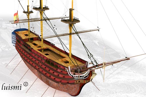 Aprovechando aficiones, y que el bicentenario de trafalgar esta a la vuelta de la esquina, un modelo del santísima trinidad. El angelito calzaba 140 cañones y 61pregunta de eslora (largo). El único navío con 4 baterías o filas de cañones). Todo lo cual no le sirvió de mucho, pues hizo glú-glú apachas con el fuego enemigo (inglés) y el temporal del estretcho de Gibraltar.