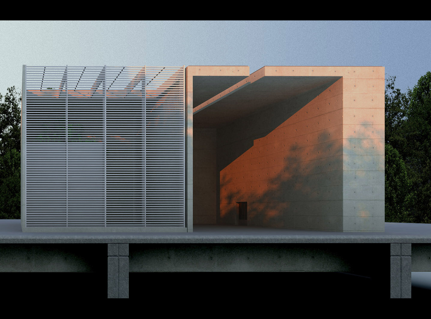 La verdad es que ese problema lo podría haber solucionado con el Adobe Photoshop, pero siendo un ejercicio de iluminación puro y duro quise mantener el render tal y como salió del 3dsMax. Lo único que le metí en Adobe Photoshop fueron los árboles del fondo.