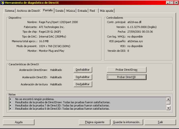 Bue-no, después de un arduo día, por fin sale algo más o menos bien. Me han cedido una Ati 128 Rage (16 megas, había entendido 128 megas y se me han caído los huevos al suelo -con perdón- Cuando decían que me la cedian-) y esta soporta aceleración por hardware (cosa que con la banshe no).