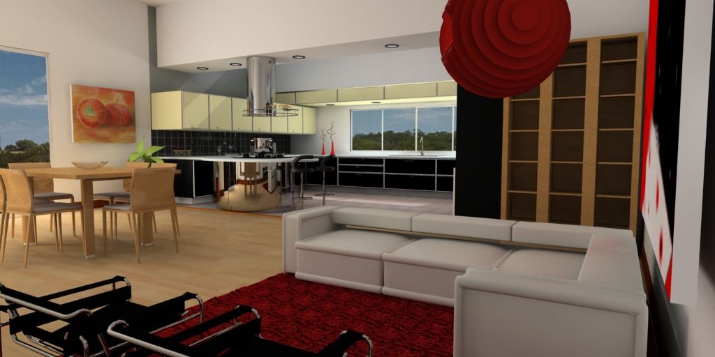 Buena de primer vistazo, pero el cuadro del primer plano está muy despegado del muro, la lámpara le metes iluminación, el cristal del librero muy oscuro y le faltan libros, también me gustaría que encendieras los spot de la cocina, y por último el exterior como que no va parece que está en medio de la selva la casa, las texturas bien aplicadas quizá a la duela un poco de reflexión.