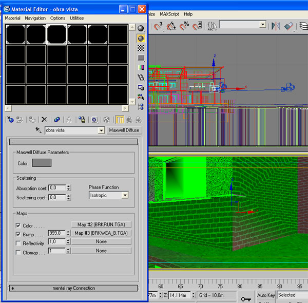Hola campeones. Estoy jugando con Maxwell y 3dstudio y no le pillo el tranquilo al Bump. Os cuelgo la imagen que me resulta, con los parámetros del Bump a tope. Los ladrillos deberían salirse de la pantalla, pero ni se enteran.