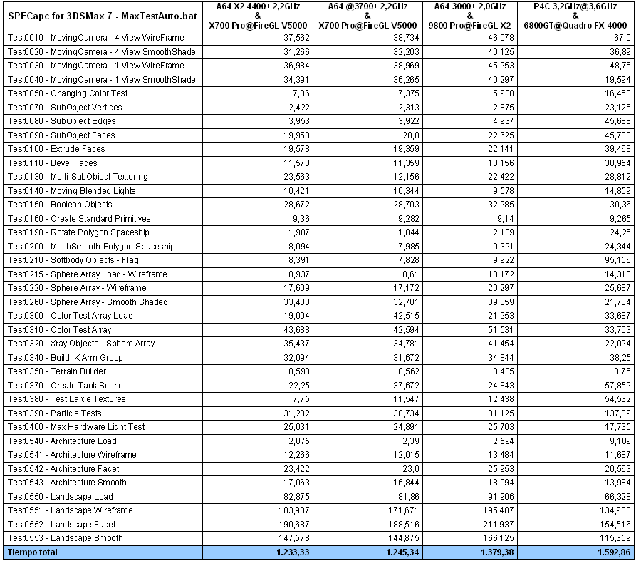 Estos son los resultados que he obtenido con un a64 x2 4400+, la referida x700 pro@FireGL v5000, 1 Gb de Ram, Maxtor dm10 SATA, en Windows XP. He usado el controlador especial de Ati para max (la configuración del controlador por defecto, sin personalizar nada).