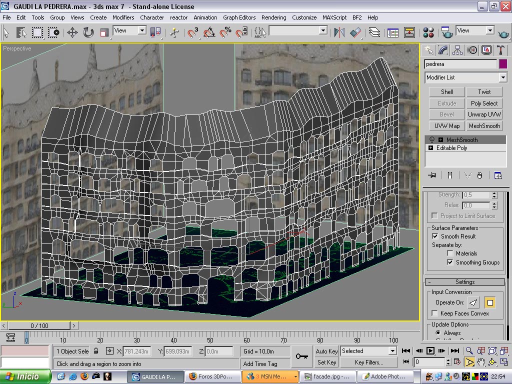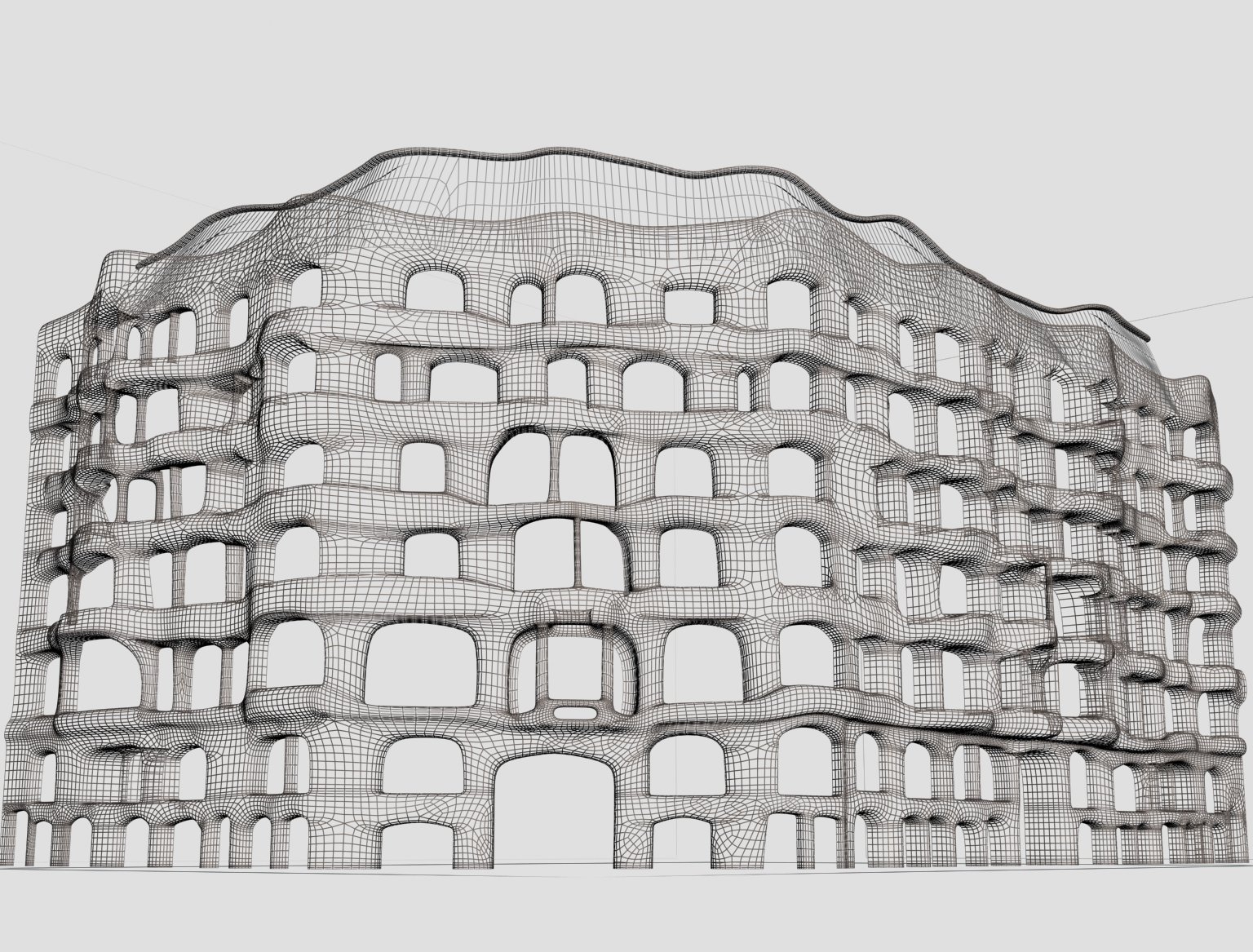Con ZBrush puedes usar una fotografía de la fachada de la pedrera como stencil e ir dibujando arriba, y literalmente ir esculpiendo la fachada de a poco. Después lo exportas desde ZBrush a 3dsMax, XSI, Autodesk Maya, o lo que quieras.