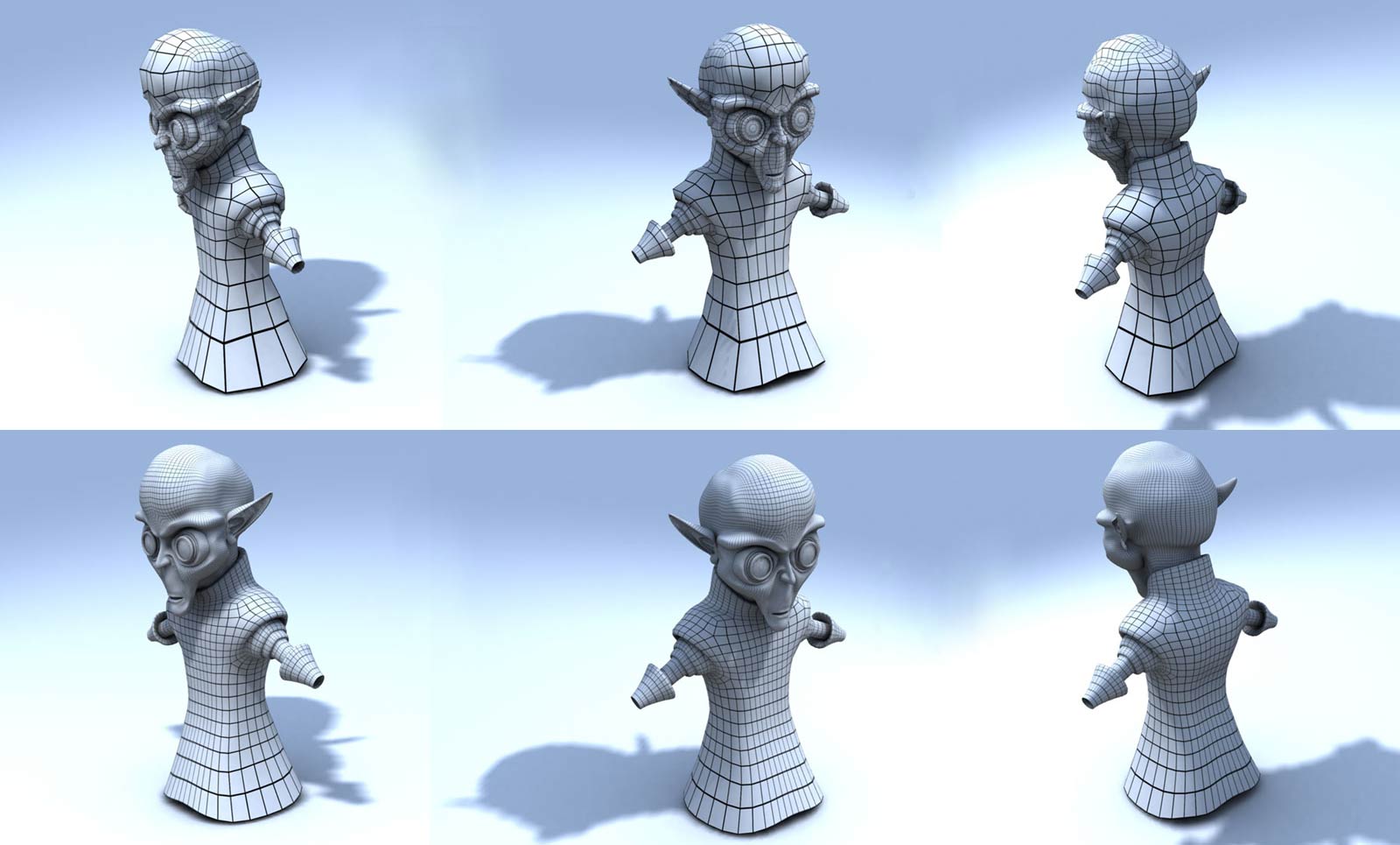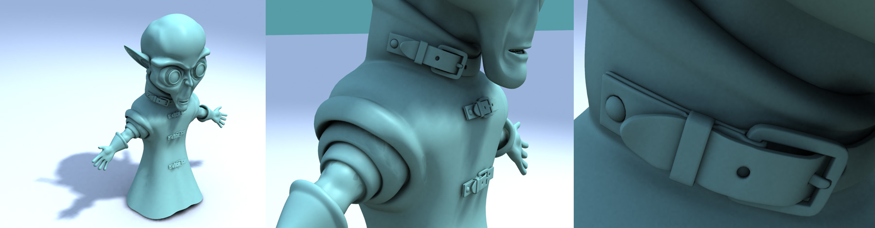 Bueno, el modelo como podéis ver, está en una fase muy temprana, la cabeza aún esta sin terminar (faltan los dientes y la parte interna de la boca), pero lo dejo para cuando acabe el cuerpo (y también hacerle arrugas, romper la simetría, y algún retoque más).