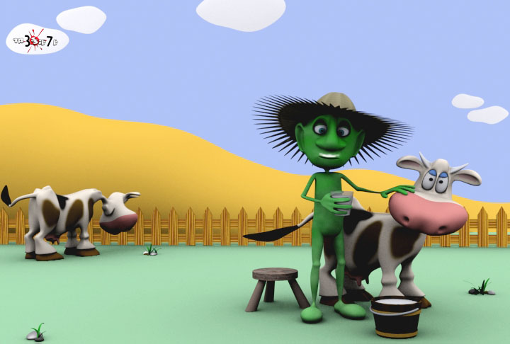 En general no está mal, muy básico todo, el suelo plano, cambiaría el suelo y le daría un poco más de vida y vestiría un poco al granjero con las ropas típicas de granja, total, es difícil ver un granjero verde en pelotas con un sombrero y bebiendo leche. Aunque como es una escena ton, pues tu mismo.