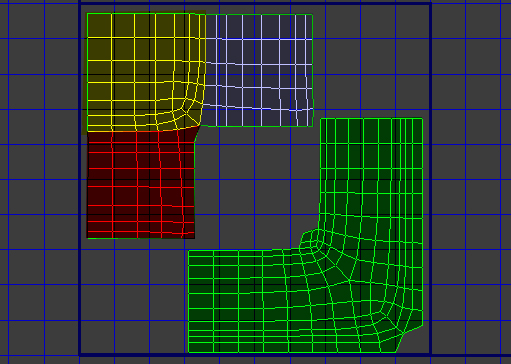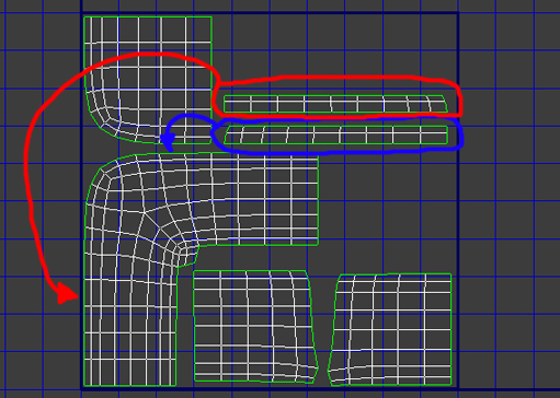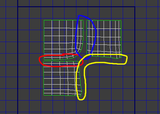 De la misma forma, en las imágenes 7a, 7b, 8, 8b, 9 y 9b, hago los stitchs para la parte de delante, pero y aquí viene mis problemas, llega un momento en que me encuentro atrapado sin saber cómo continuar, si observáis, la zona azul es la que me queda bien después de unir la malla, pero en la zona marcada con rojo, aunque tiene echa la unión los cuadrados no coinciden, y para colmo, y es lo que me tiene más desesperado, ¿cómo se hace con las zonas marcadas de amarillo, si es imposible unirlas a nada? ¿hay que romper la malla de las UV? Y si es así ¿por dónde y con que lógica? ¿cómo se hace para resolver las uniones de las zonas marcadas en rojo y verde en el plano UV?