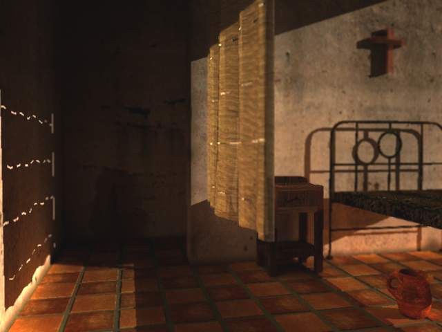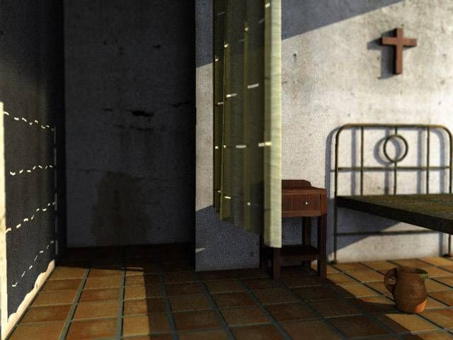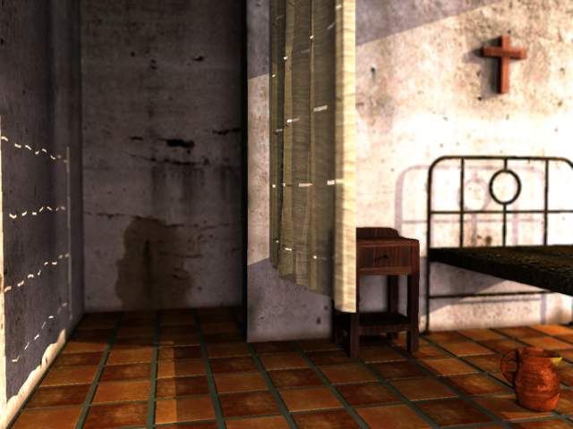 -tiempo: 24 minutos, lo de las zonas de detalle viene dado por la imagen. Yo quería hacer una habitación con ese aspecto, no me interesa añadir zonas extra para que se luzca el motor. En teoría pretendo mostrar una habitación austera (tipo monje) con lo indispensable para dormir y con una zona trasera, separada por un tabique, para que el monje pueda rezar, flagelarse, o lo que le dé la gana hacer en su intimidad, lo que me gustaría conseguir y por desconocimiento sobre el motor no he logrado.