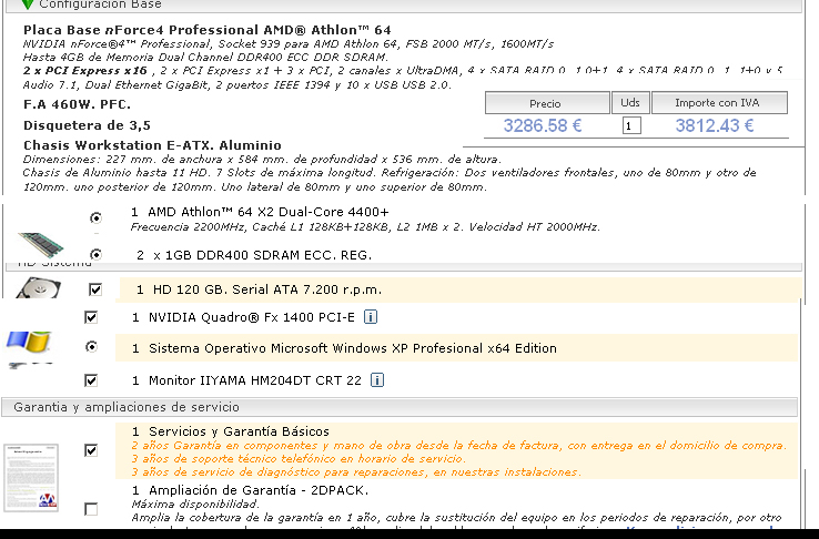 Un consejo, con esos señores, procura llevar la lista de material que precisas muy clara, nunca deseches una gráfica profesional por una de marcianos y, aunque te cueste más, pon discos SATA WD raptor para el so, luego para lo demás puedes poner un raid 0+1 con discos normales SATA y tendrás una máquina muy equilibrada y rápida, ojo a las fuentes, especificas para estaciones, nada de marquitis y que sean de potencia suficiente y con una línea de 12 VTS potente. Hay una guía de Mesh que te da todos los pasos indicados para elegir el material más optimizado. (suerte).