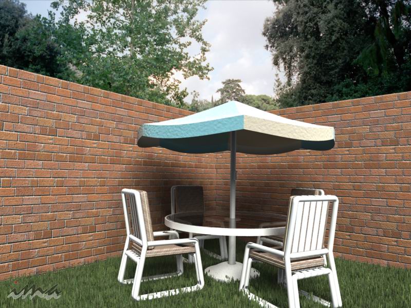 Hola. Buena imagen, pero le veo el típico fallo de la repetición de texturas en el muro. También creo que el Bump de la sombrilla no queda demasiado realista. Vaya, y ten cuidado con la hierba, que atraviesa la mesa.