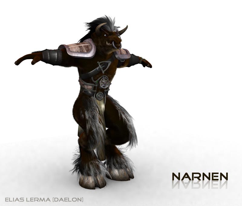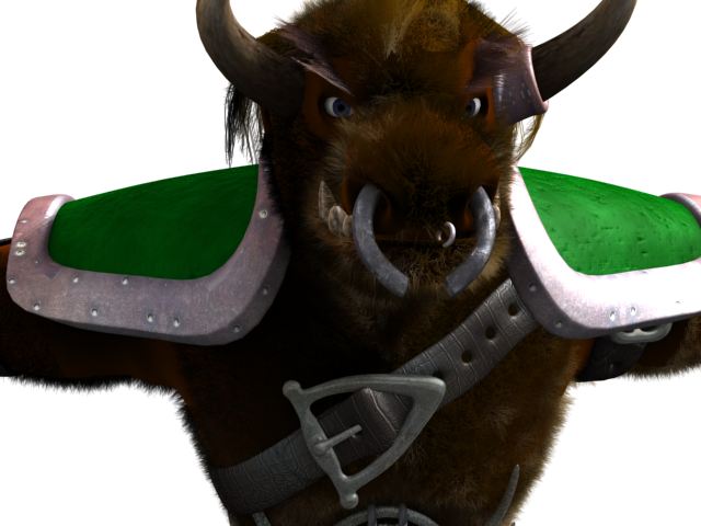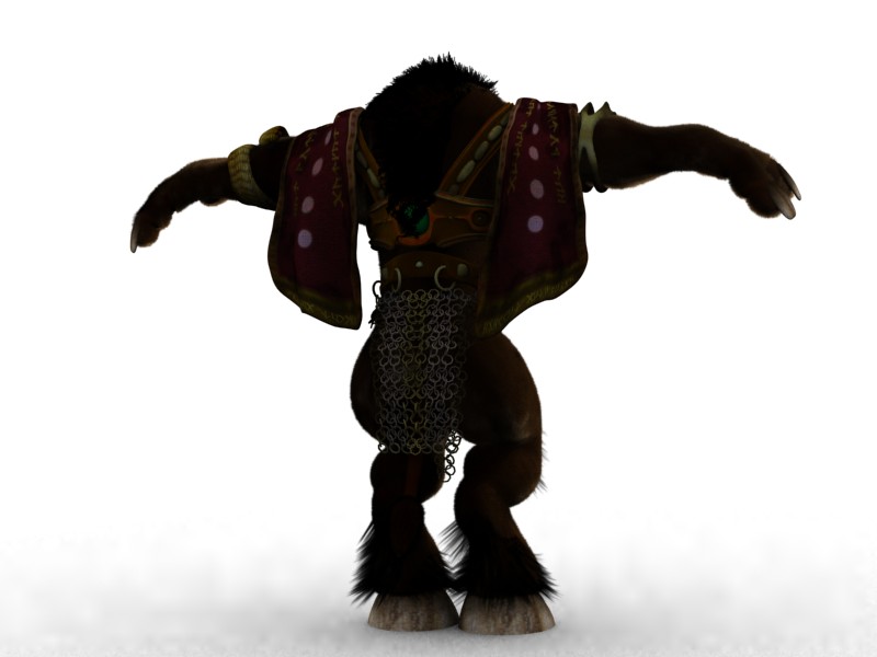 Bueno, pues yo te diría que trabajaras un poco más en el modelado, no sé si es por el pelo o no, pero no se nota nada la musculatura del Tauren, y tengo entendido que son unas máquinas de matar (incluso los shamanes) pon un wire para poder comentarlo mejor, pero vamos, no tiene aspecto de fiero y como dice Basie los brazos están un poco cortos, y utilizando un poco de lógica la hombrera no puede estar al aire, tiene que estar enganchada a la correa como lo está la otra, y creo que la textura de la correa no es la más adecuada, ponle color marrón, o si quieres la cambias por eslabones, pero ese gris no gusta nada, ánimo y suerte y sigue con ello.