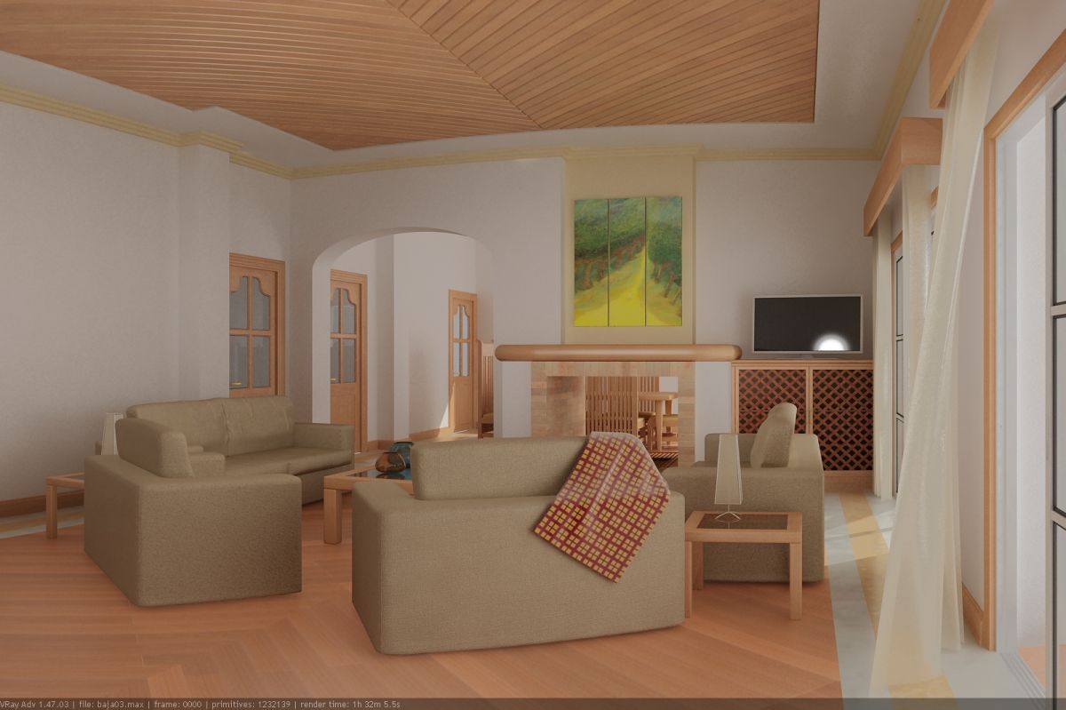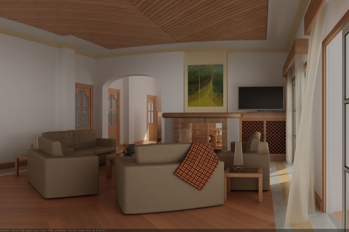 Buenas, ahora veo que la luz de sol quema mejor los pisos, está todo muy detallado, gran trabajo de verdad. Quizás lo que vea raro son los muros blancos, no sé cómo explicarlo, pero parecen que están un poco expuestos la luz rebota demasiado y parece que lo colorea, bueno es un detalle menor. El diseño sobre gustos no hay nada escrito, quizás la televisión este un poco incómoda y llame demasiado la atención en esa posición, raro de ver una televisión cerca de una ventana, si el sol pegara sobre ese lado sería difícil ver la imagen, bueno es otro detalle, quizás como dice Carlos, ese modelo puede ir, pero en otras condiciones.