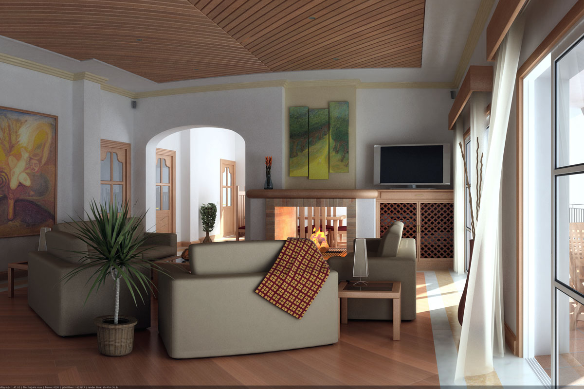 Hola, en mí modesta opinión creo que vas por buen camino, pero lo que si me parece errado es la mezcla de materiales que haces en el diseño interior: pones madera por todos lados, mobiliario de colores claros o beige, pero pones un cuadro sobre la chimenea de colores muy desentonados con la escena. Y, sobre todo, que ese modelo de televisión no va para nada con el mobiliario. Unas pautas básicas de diseño de interiores seria necesario.